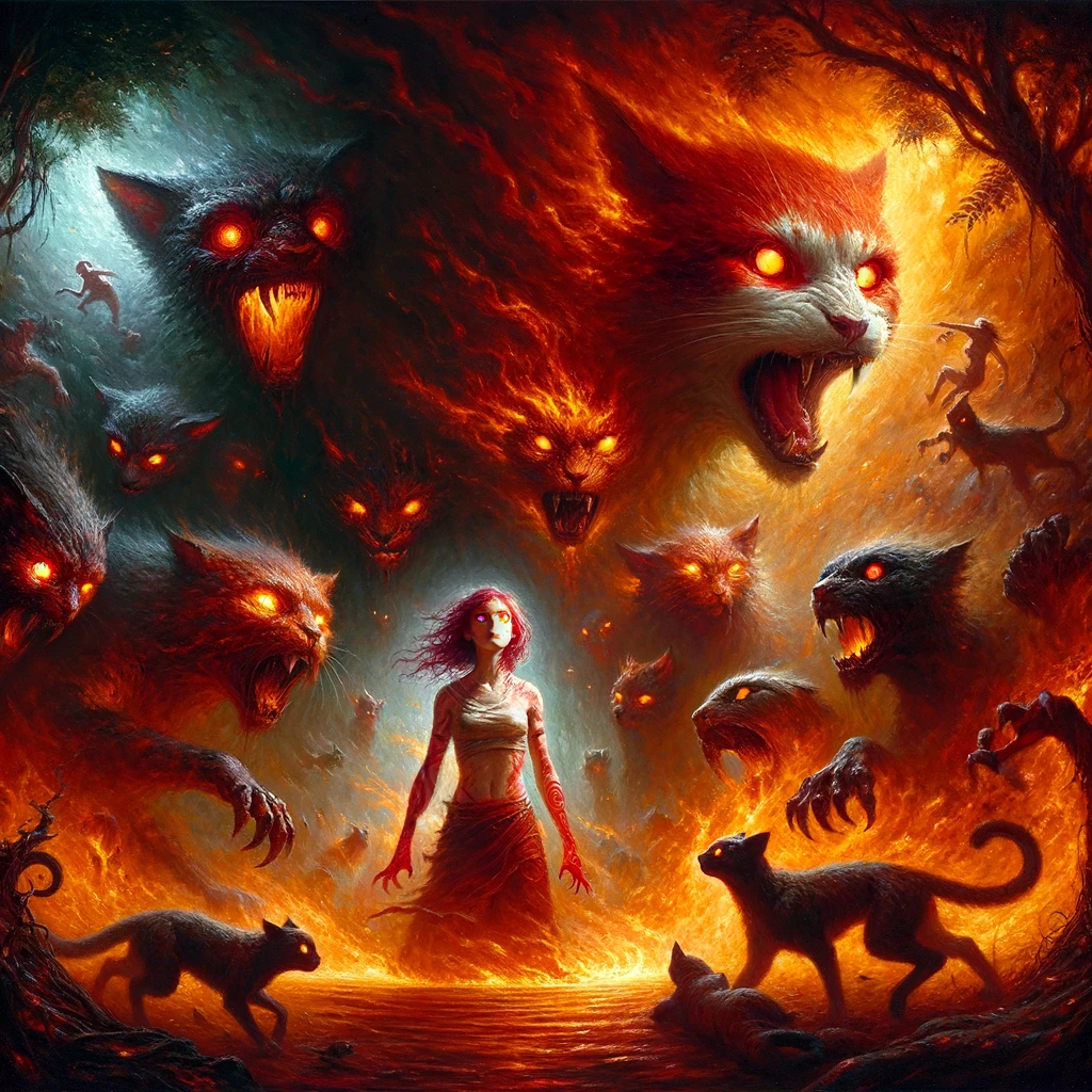 بتدفق قوتها الفطرية، تحولت ريد ودفعت ضد تيار الظلام، نظرتها القرمزية تخترق الظلال. لكن مخلوقات الليل كانت لا ترحم، أعدادهم بحر لا نهاية له من الشر. أورانج، على الرغم من قوته، أصيب بجروح تسرب جوهر الحياة، لونه الزاهي يخفت تحت الهجوم.