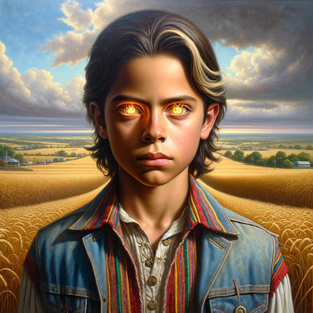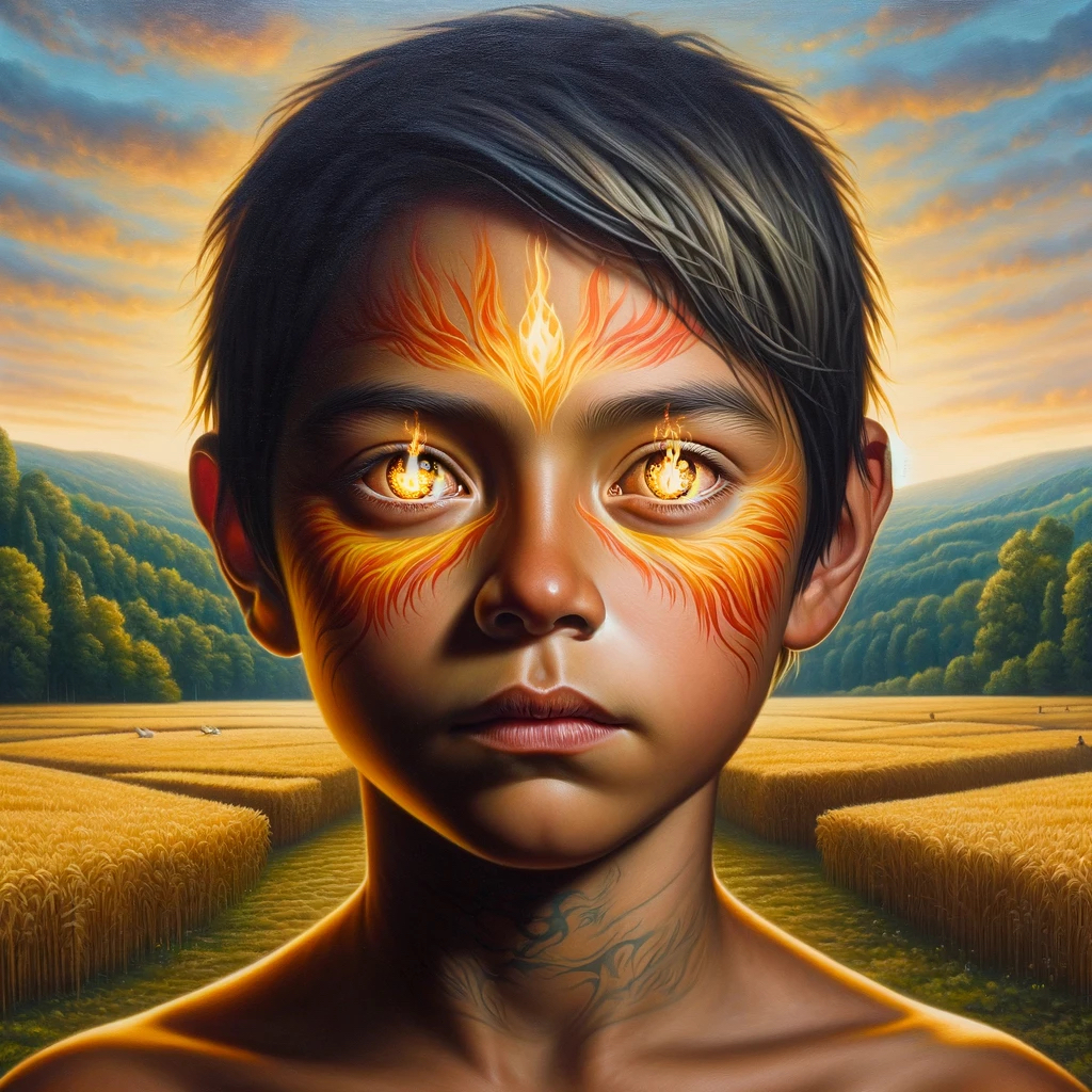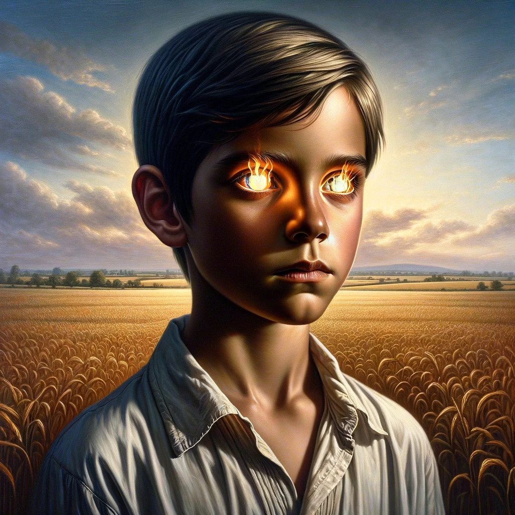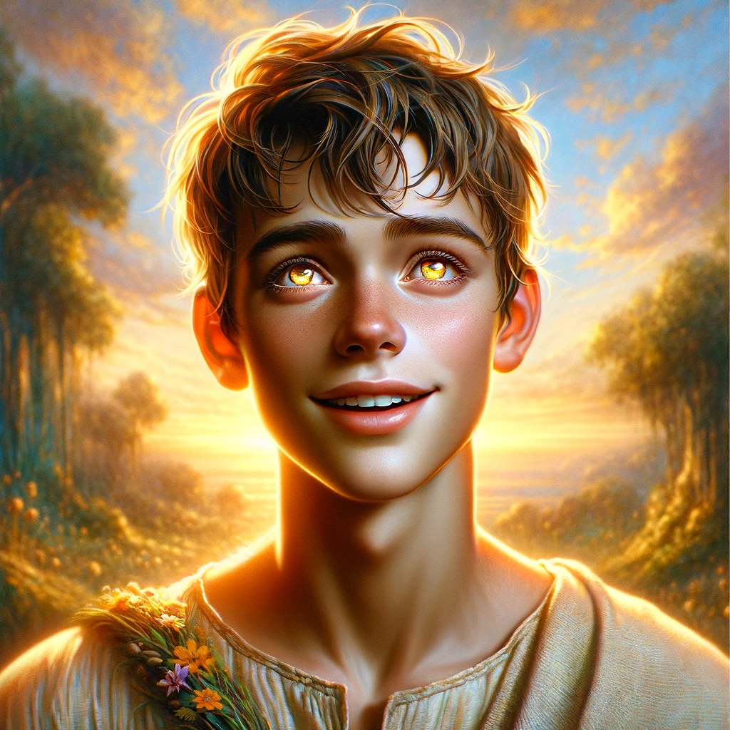 Lucius, the Last Born, was the embodiment of the gentle dawn, his eyes a reflection of the soft glow that heralds the arrival of the sun. The irises, swirling with hues of gold and orange, seemed to dance with the light of unspoiled hope and the sparkle of new beginnings. They were a beacon of innocence in a world that had known too much darkness.