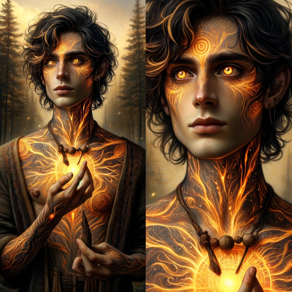 His gaze, unwavering and penetrating, seemed to reach into the heart of the forests that he so dearly cherished, communing with the spirits that dwelt within the ancient woodlands. Aelius’s visage was marked by intricate patterns that resembled the delicate, yet persistent tendrils of flames, tracing paths across his skin as if the fire within him sought expression in the physical realm. These markings, a blend of rich oranges and reds, appeared almost as if they were alive, pulsating with the rhythm of his heartbeat.
