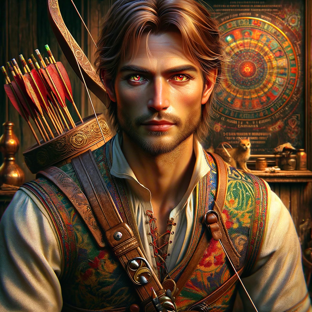 Evander’s stance was relaxed yet poised, a posture of readiness that spoke of his preparedness for both the figurative and literal journeys ahead. The quiver of arrows upon his back was not just for defense but symbolic of his role as a seeker, each arrow representing his aim to uncover truth and forge connections.