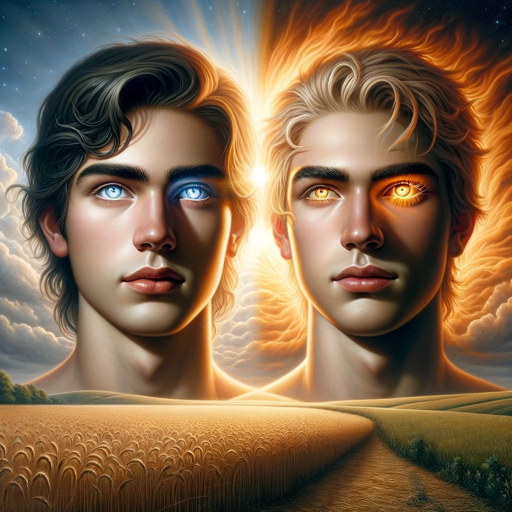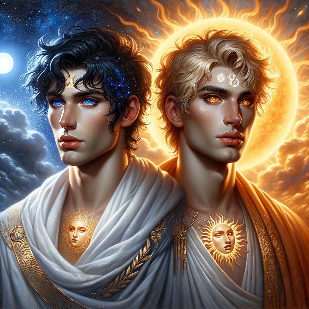 Orion and Helios, the twin sons of light and fire, stood side by side, as much a part of each other as they were their own beings. They were a duality made manifest – Orion with eyes that mirrored the depths of the ocean and the expanse of the sky, and Helios with a gaze as warm and piercing as the rays of the sun they were named after.