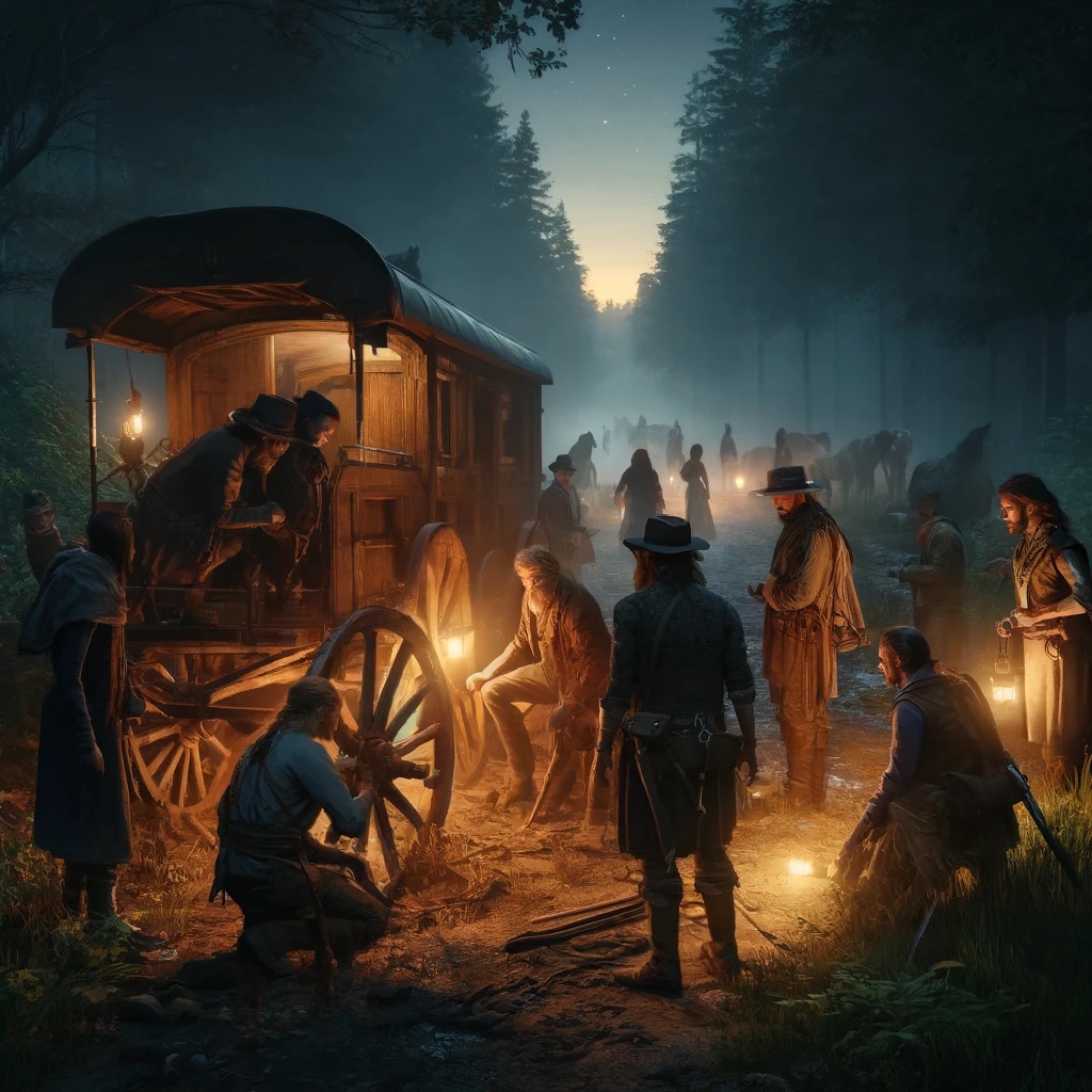 Yet, as we ventured deeper into the unfolding evening, an unexpected turn of events briefly halted our march. A minor mishap, seemingly inconsequential at first—a cartwheel coming loose on one of the supply wagons—suddenly stopped the caravan in its tracks. The wagon, laden with essentials meant for our night’s encampment, became an immovable anchor, pulling a ripple of concern through the once merry troupe.