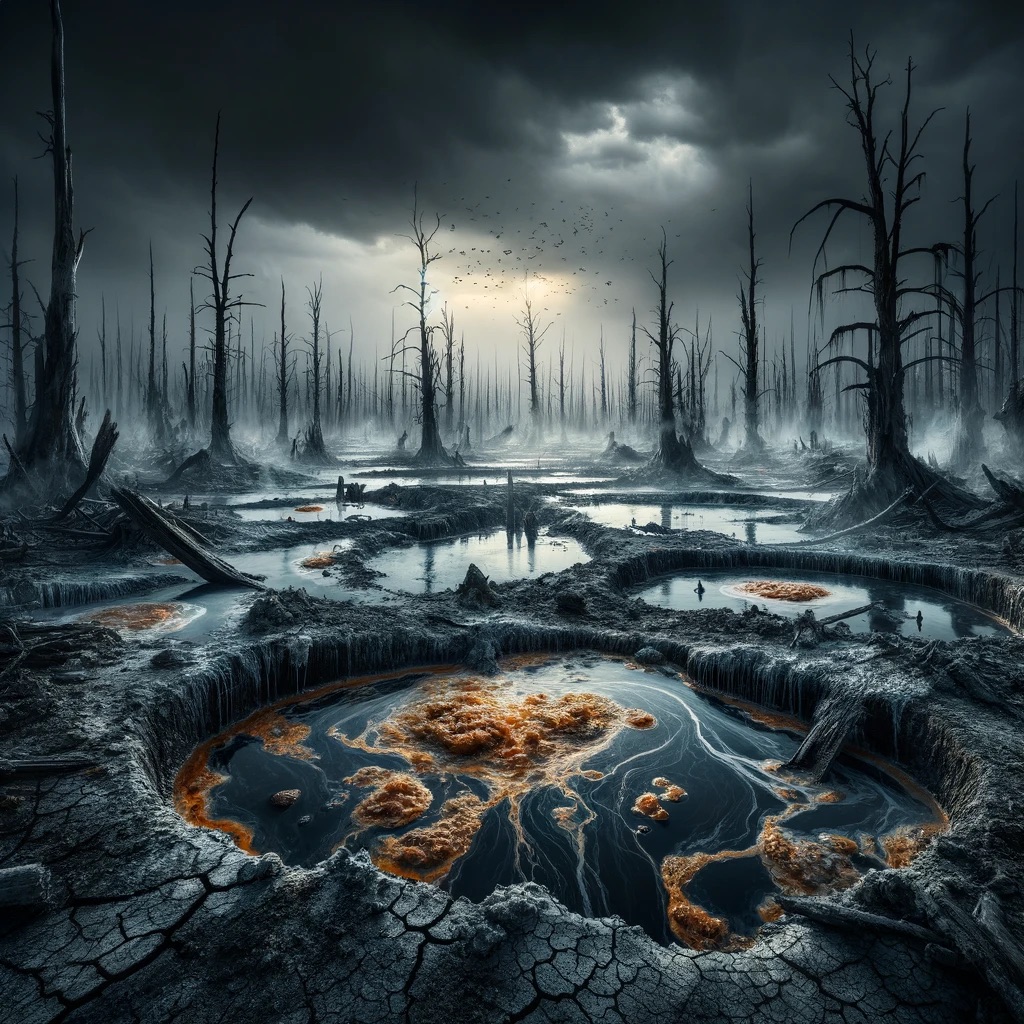 The landscape was dotted with these corrosive pools, each one a death trap that claimed anything and anyone unwary enough to come too close. The water, if it could still be called that, was a lurid green, opaque and deceptively still, hiding the lethal potency of its chemical stew.