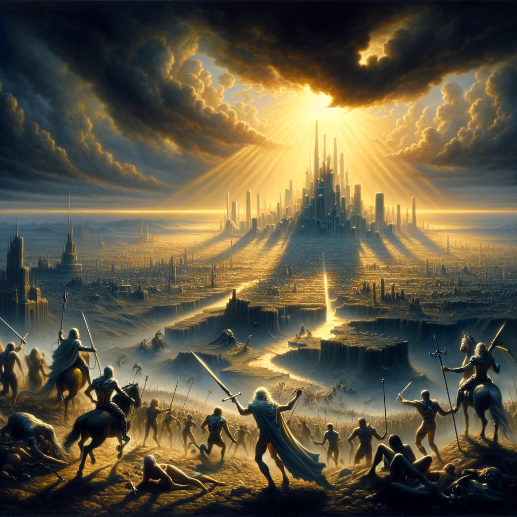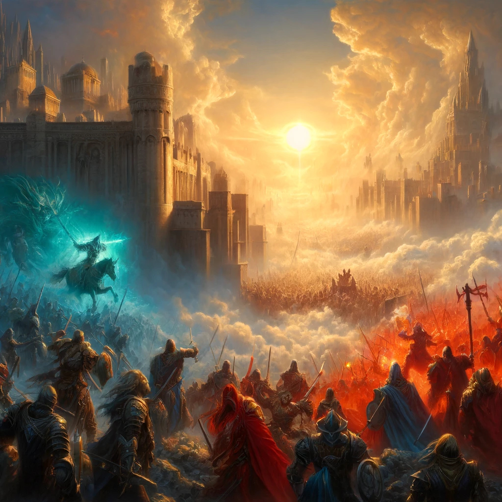 The invasion began with the rising sun, the warriors with teal eyes charging with a ferocity that spoke of their desperation to conquer. The clash of steel and the roar of magic filled the air, a symphony of chaos that threatened to overwhelm the defenders of New Jerusalem.